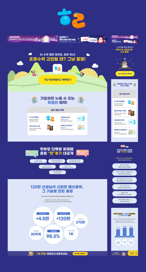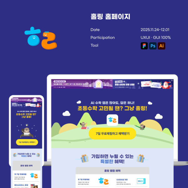 홀링 랜딩 페이지는 파랑과 주황색을 주요 색상으로 사용하여 밝고 활기찬 분위기를 조성하며, 중앙에 귀여운 캐릭터와 삽화를 배치하여 초등 수학 교육 서비스라는 제품의 특징을 잘 드러냅니다. Type 랜딩페이지 Client 홀링 Language 한국어 목록 다음글MayField 홈페이지 25.12.01